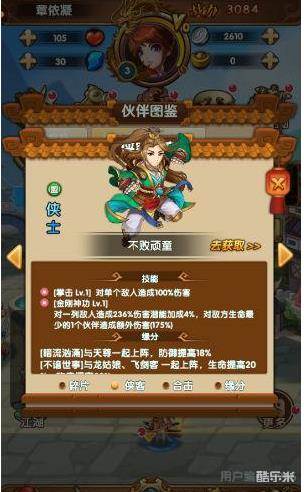 不败顽童是一个攻击型的橙色侠士,技能方面,一技能拳击只是单纯的单体伤害,没有附带的特殊效果。二技能金刚神攻是能够对一列敌人造成伤害,附带对地方上生命值最少的一个伙伴造成额外伤害的效果,可以在加强不败顽童伤害输出的同时,对敌人起到概率性的收割作用,当然这个就是运气成分比较重要了。不败顽童没有合击技能,不过其缘分效果还是不错的,和很多橙色侠士能够激活,比较的方便。
