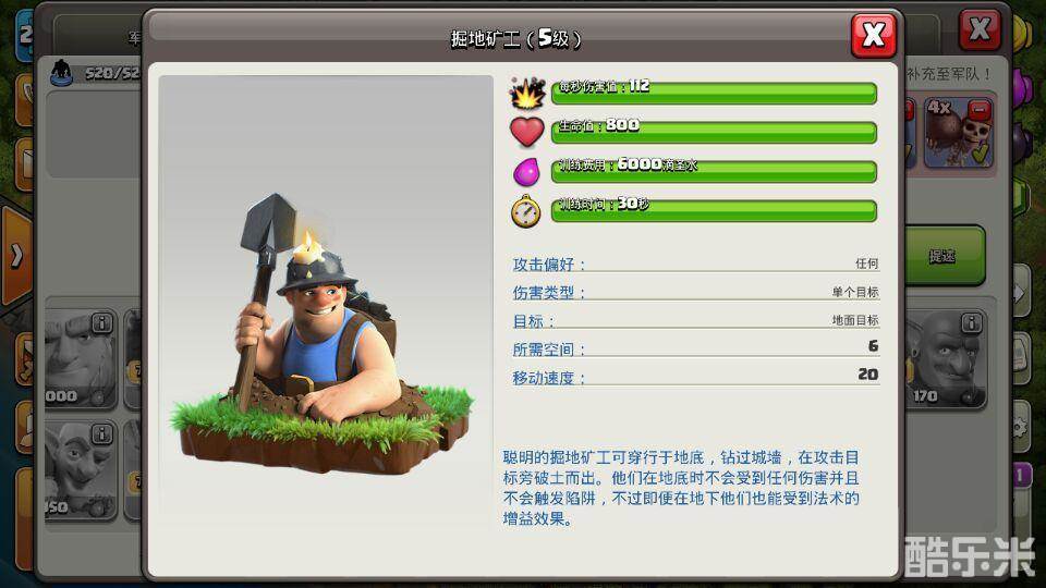 与除野猪外的其他陆军不同,掘地矿工具有穿行地底,在攻击目标旁破土而出的攻击特点,他可以无视城墙,不受引导,并且和野猪的跳墙不同,矿工在地底通行时不会受到伤害,并且不会触发陷阱,而且即使在地下,他们也能受到法术的增益效果。矿工在数据上也是非常好看的,伤害值约为法师的一半但血量却是法师的三倍,可以说是非常强力的。矿工最怕的是区域性范围性的群伤攻击,法师塔,地狱塔,巨型炸弹和隐形炸弹对矿工的克制最大。需要提前注意好对方的布阵,猜测陷阱的位置,规划好进攻路线避免矿工被集火造成团灭。