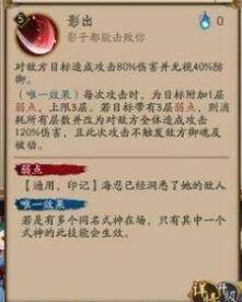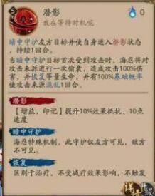 效果:暗中守护友方目标并使自身进入潜影状态,持续1回合。当暗中守护目标首次受到攻击时,海忍将对攻击来源进行一次偷袭,造成攻击100%伤害,并恢复等量生命,并有100%基础概率使攻击来源混乱1回合。