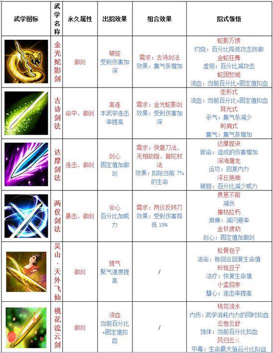 五阶江湖武学-剑系总共有6个技能:金光蛇影剑、古诗剑法、达摩剑法、两仪剑法、吴山·天外飞剑、桃花流云剑,各有千秋玩家可以根据实际情况自由搭配