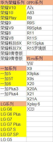 另外小辰给大家整理一张部分满足配置的机型图,下图为目前市面上1500以上的机子,白色名单部分机型可能存在运行不了情况,黄色名单几乎能满足游戏的要求,当然名单上没有的也不代表不能玩,具体要看手机的价位和配置!