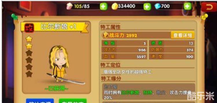 总的上来说,比尔新娘是一个对于己方阵容搭配有一定要求的特工,如果说己方女性角色不多的话,那么比尔新娘的作用也就一般。并且比尔新娘还需要看对方阵容使用,如果对方没有女性角色,那么比尔新娘就等于是浪费了一个被动效果。所以个人觉得比尔新娘不太值得花资源去培养,希望对大家有所帮助。