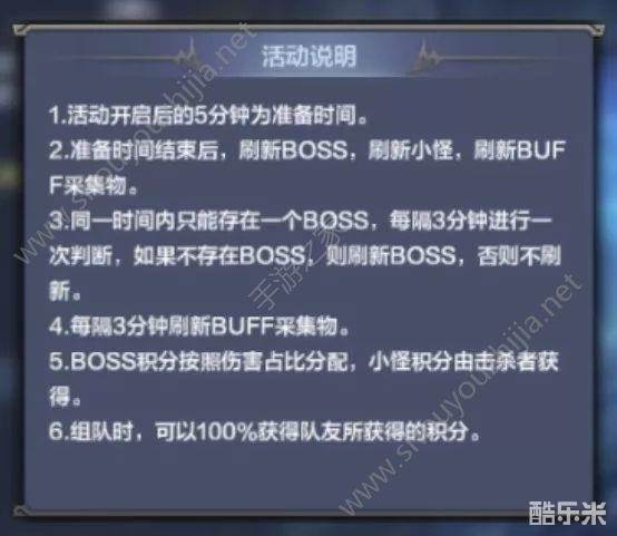 元素试炼有30分钟的时间限制,其中包括等待的5分钟准备时间。所以勇士只有25分钟来采集BUFF物、击杀小怪、击杀BOSS,以追求更多的积分。