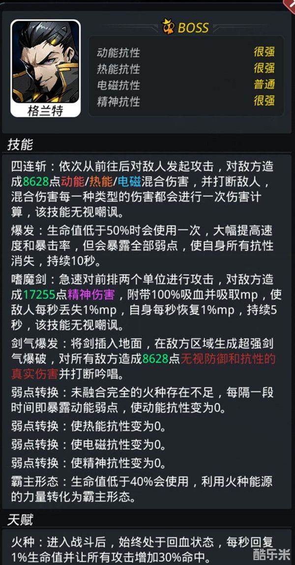 格兰特拥有着出色的动能、热能、和精神抗性,即时相对较弱的电磁抗性也算不上是弱点。