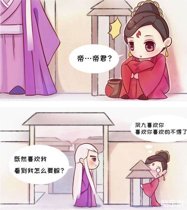 曾有一次,凤九以为帝君酒醉了,在帝君面说了好多的心里话,还偷偷的亲了帝君。当凤九变回狐狸时,爬在帝君的腿上瞎想,问自己帝君是不是装的。此时,帝君原本摸她的动作也停下来。他们四目相对,分外尴尬。所幸,凤九不知道帝君能听到她说的话。但也正因如此,凤九常常胡思乱想,恰似一名被感情困扰的小女生。