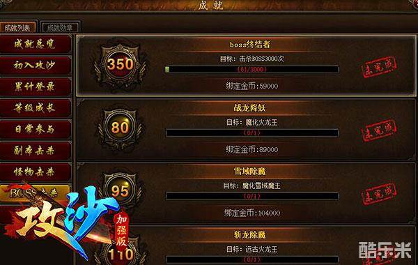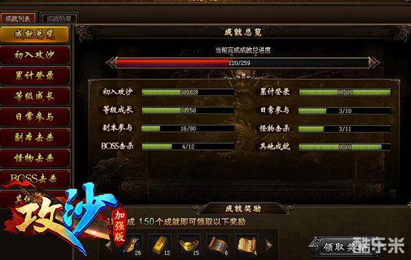 1、成就系统中共有多种栏目:初入攻沙、累积登录、等级成长、日常参与、副本击杀、怪物击杀、BOSS击杀和其他成就,玩家根据成就系统的总览来,可直接看到自己的成长轨迹!