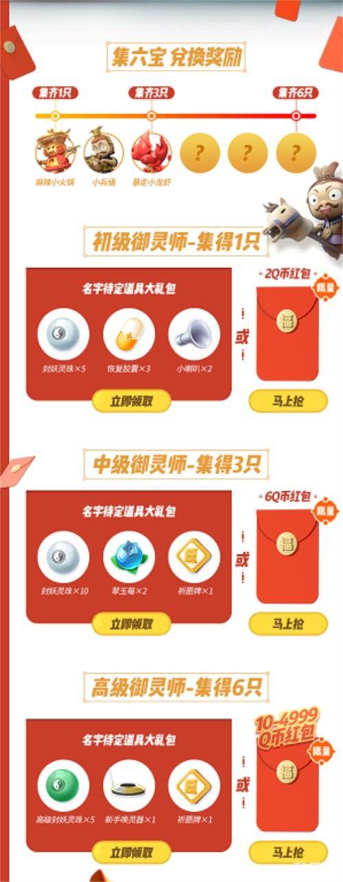 而集地域六宝瓜分百万现金活动也将在4月13日上线。玩家邀请好友,即可额外获得六宝铃铛捕捉“貂宝”“小兵俑”“暴走小龙虾”“小白蛇”“麻辣小火锅”“舞狮”六个地域妖。集得1只、3只、6只地域妖可分别获得“初级”“中级”“高级”御灵师称号,每个称号都有对应的道具礼包或渠道专属奖励,以QQ渠道“御灵师”为例,最高可获得4999Q币红包。