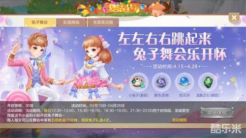 兔子舞会在4月15日-4月28日活动期间定时开启,达到30级的幻想家每日12:30~13:00,15:30~16:00,18:30~19:00,21:30~22:00四个时间段可以参加活动。