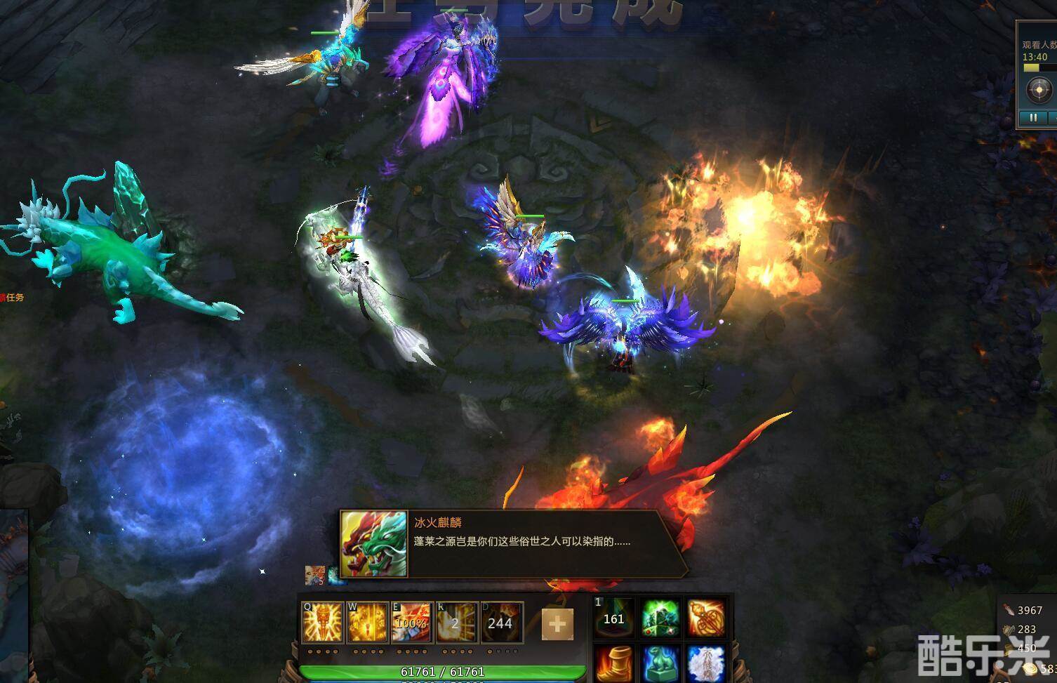 所有人注意:麒麟放激光会说话。眼疾手快果断开BKB,基本上BKB正好CD好了。他就放激光。 这里其实是血量控制的。别计较那么多。就是眼疾手快。 麒麟还会乱跳。在某人脚下出个红色或者蓝色的圈,这个技能没多大伤害,勤走位。就不会打到。 它跳完,有可能跳到一起。仇恨会消失。需要拉怪的用手套把各自的麒麟拉走。要是不小心两个麒麟都跟一个人,果断其他人集火他以前不拉的那个。拿走仇恨。 如果打的慢,会提示麒麟60秒后狂暴。这个是团队伤害低。没办法。狂暴了就勤走位。
