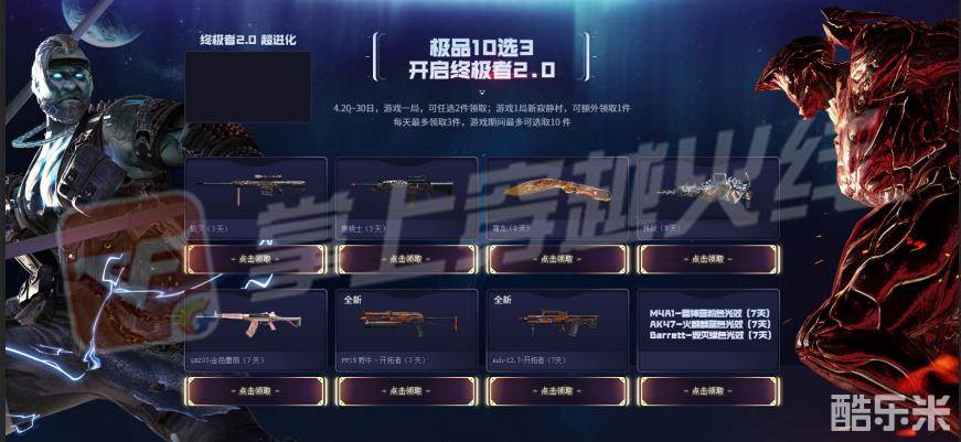 首先是一道熟悉的开胃菜“极品10选3”,其中可是包含有大批超实用的英雄级武器、全新开拓者系列以及枪械光效。不管是用来实用、装扮以及尝鲜,都能满足各位小伙伴的不同需求。尤其是其中的金色蔷薇、炼狱和毁灭,定可在新生化玩法降临之际祝助大家一臂之力!需要注意的是,本版块内的所有奖励可是有机会通通打包带走的喔~各位小伙伴可千万不要错过呀!