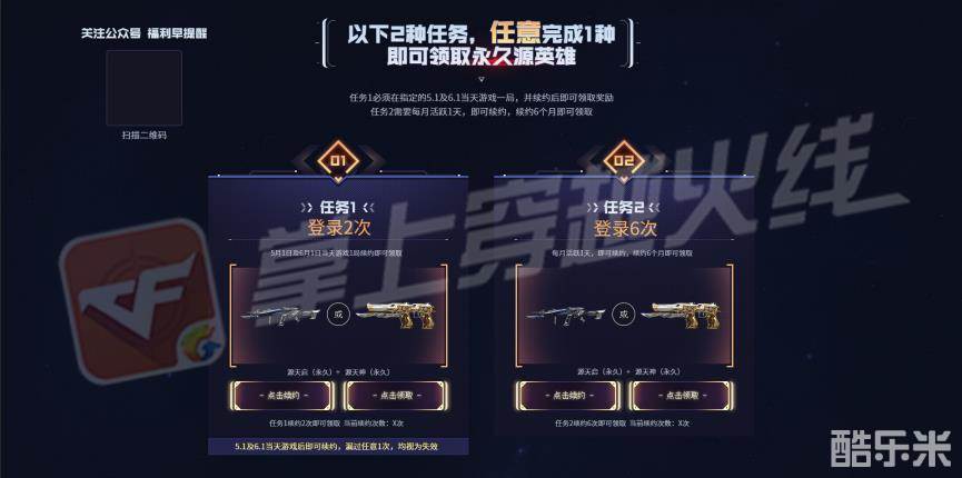 不仅如此,相比较于以往领取源武器的方式,本次也是进行改良。共分为两种任务可选择执行,其一则是需要在5月1日和6月1日当天游戏一局;其二则是我们比较熟悉的每月活跃一天,需要续约六次。不过根据目前的情况来看,想必所有小伙伴都会选择前者啦!虽然有着限定时间,但分别处于节假日和周末,相信大家都会有足够的空闲时间来完成,如此是不是更为方便快捷了呢?