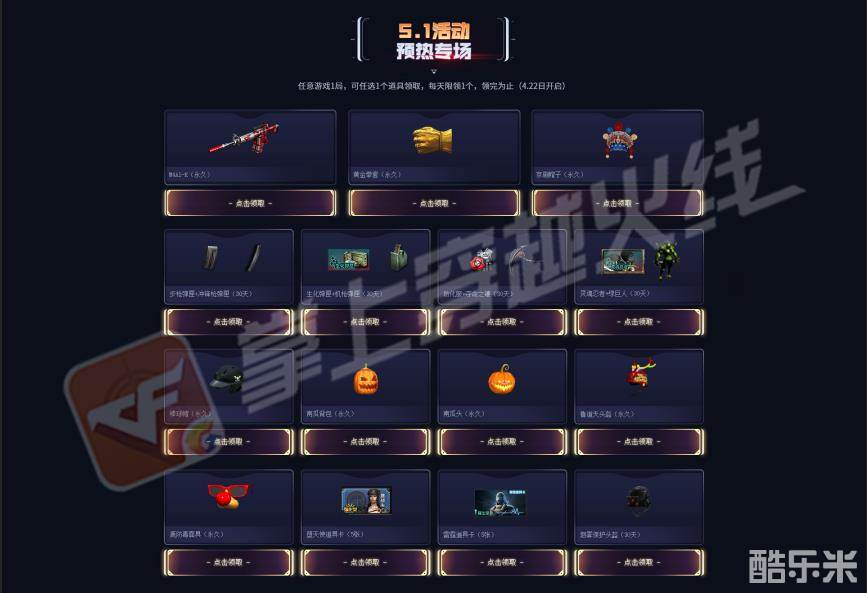 既然说到了5月1日,那么本次活动也将开启接下来的预热专场!其中可是准备了多款永久武器道具喔,其中既有M4A1-K、黄金铁拳,更有京剧帽子、南瓜套装等等。之前错过它们的小伙伴可是借此机会查漏补缺,毕竟只要每天游戏一局即可开始领取。不仅如此,本版块还准备了一大批超实用的道具,除了那些备受欢迎的挑战道具卡、烟雾头等,还准备了各式各样的生化道具喔!