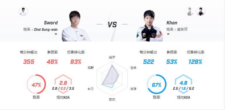 Sword是一名能抗能打的上单,虽然明显队友更喜欢他选坦克(后半段GRF输的比赛中Sword都选的输出型上单)。他个人非常注重对线,十分想要一个证明自己的机会,在赛前采访中说希望对面不要来上,让他和Khan好好对线一次。本次BO5中很有可能在第二局让Sword选出线上压制力强的英雄来和Khan打一次。第一局大概率还是会让他选择坦克为了赢下一分稳定众心。Khan在本次春季赛出场47次仅仅使用了7次纯坦克英雄!一方面说明了他不喜欢线上抗压的感觉,另一方面也说明他本人并不适合玩坦克型上单。在本次巅峰的BO5中应该不会让他选出纯坦的英雄,一定会让他在线上尽可能压制Sword。在数据榜上Khan分均伤害和分均承伤都是领先对手,上路的压制很有可能让Khan的单带变得很难处理,所以Sword要抗住压力呼叫打野在前期对Khan进行针对。