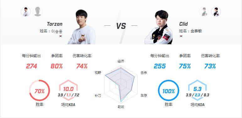 在GRF胜出的31局比赛中Tarzan拿到了20次MVP。作为GRF最核心的一个点,独特的打野思路和细腻的视野把控都让Tarzan成为LCK最强打野之一。可以说Tarzan的表现直接决定GRF能否在BO5中胜出。Clid在重回韩国后本赛季表现也很突出,他最爱用的盲僧(19场)、皇子(10场)都表现的非常优秀,GRF教练团应该会针对这两个英雄来BAN,如果拿不到他们Clid的发挥就会稍打折扣。数据对比中分均伤害和承伤Tarzan都略高于Clid,参团率两位相同。期待两位选手在野区的精彩发挥。