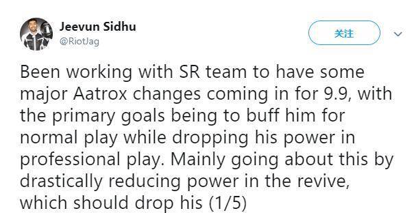 鉴于亚托克斯在职业赛场的优先度大幅降低,而且这个英雄有很高的人气。设计师RiotJag今天在个人推特上表示,在下周的9.9版本测试服中,他决定回调亚托克斯的E技能改动。亚托克斯的E技能重新获得充能机制,最多可以释放最多两次,后期两次E技能的释放间隔变成1秒,让亚托克斯可以QEQE闪Q打出TheShy往日团战以一敌四的风采了。