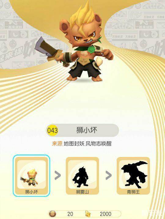 狮小坏→狮震山→青狮王,本路径三只妖灵都可以通过地图封妖和风物志觉醒获得~