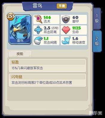 雷鸟作为一张法术攻击的卡牌,自身拥有15%的闪避被动技能,同时重甲属性,在面对利刃波次,可以获得更多的输出能力,2级闪电链技能给予额外法术输出
