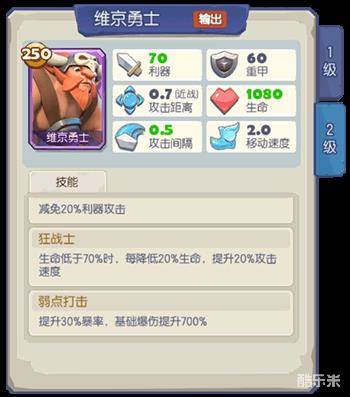 维京勇士作为一张近战利刃卡牌,虽然初始攻击并不是很高,但在升级到2级后,概率触发弱点打击技能,可将爆伤提升700%,且血量越低攻击速度越快,输出能力达到一个恐怖,但是本身血量低,在后期需要前排肉盾的伤害分摊
