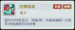 恐惧音波:提升200%攻击力,持续3秒,并造成身前一片敌军2秒眩晕和120%伤害。