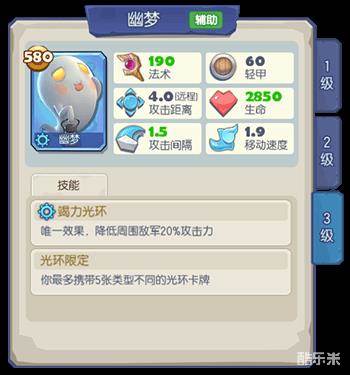 很多玩家都知道,光环兵一张整体BUFF加成的卡牌,他的存在可以让所有兵种获得一个全体的增益,越往后期效果越大,幽梦和毒师是梦塔防中唯二的减攻击的光环兵种,效果可叠加,幽梦的生存能力大于毒师,因为幽梦是远程而毒师是近战,3级幽梦可降低周围友军20%攻击力,当对战开始时,幽梦的远程效果可以大大避免被系统怪集火而早早的死掉,从而发挥出最大的减攻效果