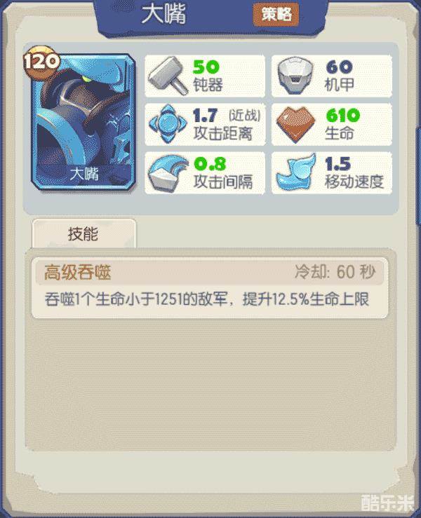 其实大嘴这张牌,用于前期策略打法,7波前较强势,因为7波前发的兵都能够被2级大嘴完美吞噬,但是7后500兵力开始就吞噬不了