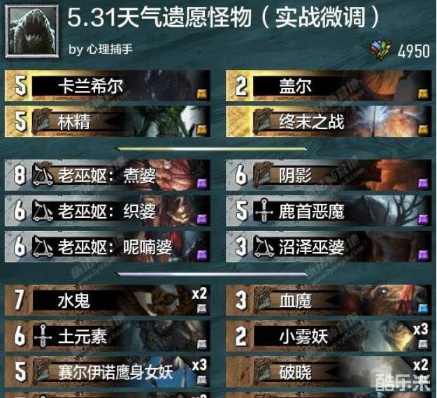 没错,推荐了这两张卡就是推荐天气怪物的套路。参加营地的几篇世界前X的套牌攻略,怪物的天气思路在天梯真的很强!很强!很强!可以满编猎犬和浓雾作为潇洒写意视对面4张晴天为无物的纯天气控制套牌,也可以外挂吞噬稳扎稳打,吞噬天气也是本人天梯之旅中唯一对阵胜率不过半的套牌。