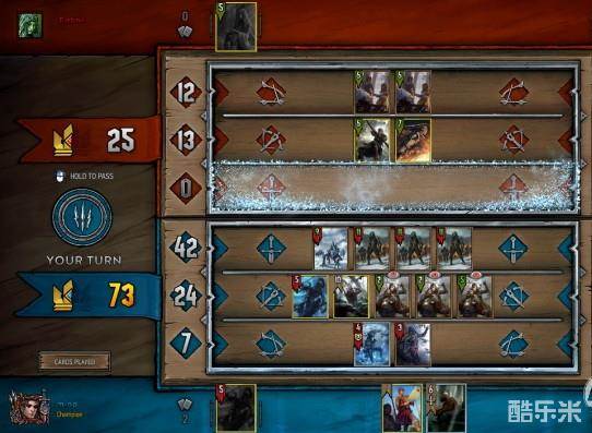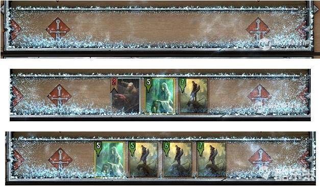 操作细节:埃丝涅的智商也是硬伤,我们只要起手把刺骨冰霜打到boss的近战牌就好了......然后她就会不断地把自己的单位派打到我们的冰霜里......轻松拿下第一局。决胜局时埃丝涅会打出伊欧菲斯这张点数算是比较大的金卡,但是只要我们卡差不落后,我们就能轻松拿。