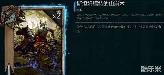 这张牌会在出场时,自动削弱自己1战力,即便如此,他仍然拥有很高的8战力。而更为关键的是,“战吼”,这张中立铜色特殊牌,能让己方所有受到削弱的单位获得战力翻倍的效果,奎特家族战士十分强大,各位玩家可以好好利用他。