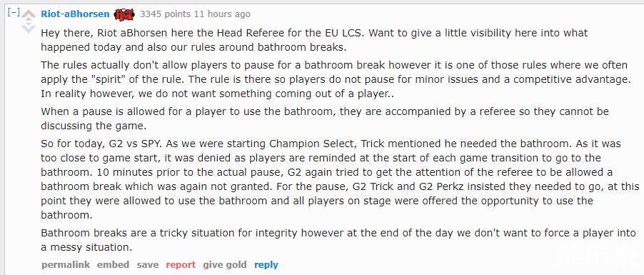原来,早在这一次暂停之前,Trick在游戏的BP阶段和10分钟左右已经请求了两次暂停,但都遭到了Riot裁判的拒绝。而在之后的比赛过程中,Perkz和Trick两人不断提出非去不可的请求,最终才被允许暂停了游戏。根据aBhorsen的描述,尽管Riot的规则书上写明了禁止选手在比赛期间如厕,但这一规定往往在执行时会有些弹性——因为没有人真的想看到选手在赛场上“湿身”。另外,选手如厕期间也会有Riot的裁判一路跟随,防止队员在暂停期间进行战术交流。
