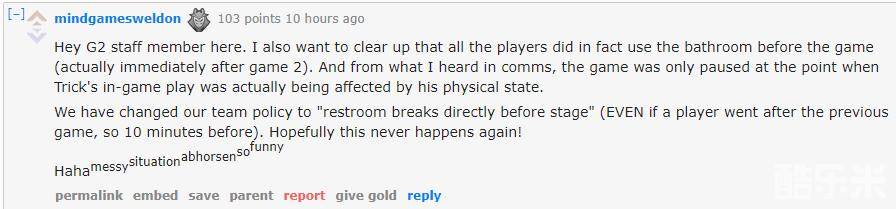 而G2的助理教练Weldon也在评论中讲述了当时的具体情况。从比赛语音中可以听出,Trick的游戏内发挥已经受到了生理需求的影响,而官方也是在不得已的情况下才通过了G2的暂停请求。