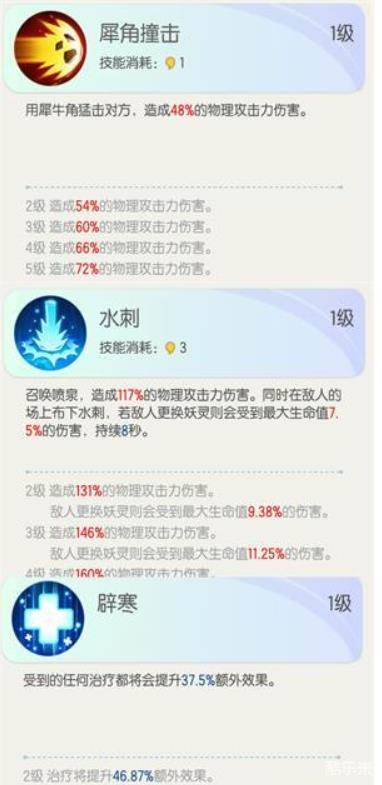同时它具有犀角撞击、水刺和辟寒三个技能,这三个技能分别在一二三次妖灵觉醒时开启。