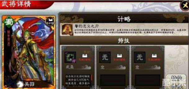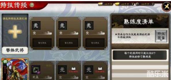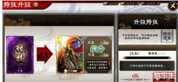 1、消耗一名持有相同特技的武将,可提升特技的等级,升级无论成功/失败被当做材料的武将卡均会消失