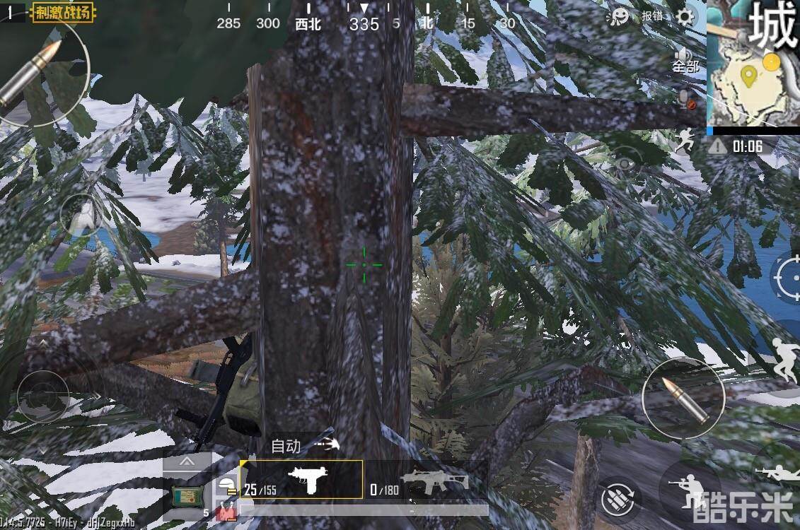 雪地地图中的这颗树就在雪地的城堡外,跳到城堡最高的房顶,找到离城堡围墙最近的树就是了。这棵树跳上去需要一定的技巧,需要对准树干中间的位置进行跳跃卡点,跳上去之后会被整个树干包裹,和整个树干合二为一,非常隐蔽。但需要注意的是,鸡友没有成功卡住的话掉下去会损失大半血量,尝试之前一定要确保自身的安全。