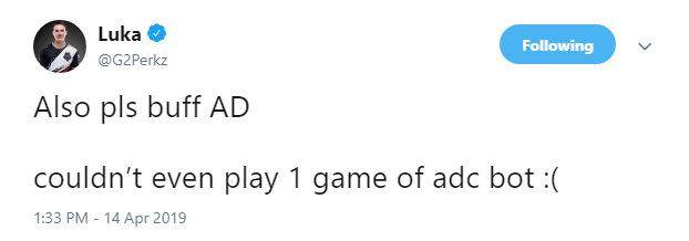 在拿下冠军之后,Perkz凌晨更新了推特,主要内容是:也加强一下AD吧,在比赛中一场下路AD都不能玩!不得不说Perkz真的是骚话满天飞,本来以为他会发推庆祝下夺冠之类的,没想到却先调侃了下路英雄强度。