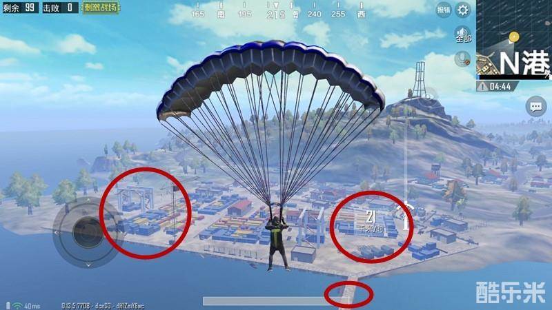 三个红圈是小编为大家推荐的最佳降落点,由于集装箱上物资丰富的特点,所以仓库在N港并不是玩家开局落地的最佳选择。图片下方的小红圈,则是对想去N港的玩家在航线不友好的情况下选择的。玩家可以选择降落在小红圈的桥上跑步进入N港,毕竟跑步是比游泳快许多的。而两个大红圈则是具有得天独厚的地形优势——高架。