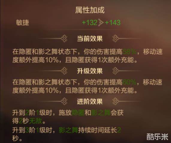 隐匿,一阶一级的时候,隐匿会获得额外一次的充能,也就是说从最初的一次隐身变成拥有两次隐身。