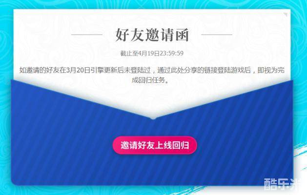 即日起至4月19日23:59:59,玩家登录“双重好礼回归季”活动页面邀请在3月20日新引擎更新后未登录游戏的好友,且该好友通过玩家分享的链接登录游戏,即视为玩家成功邀请好友且好友完成回归任务,邀请人与回归玩家均可获得活动好礼。(每位回归玩家仅能接受一名好友的邀请)