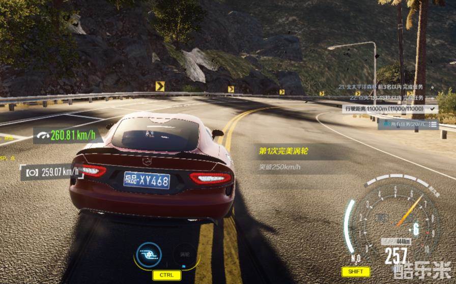 在试驾环节中,对道奇蝰蛇进行加速测试。赛车的加速度还算不错,转数的攀升很慢,通常每挡的间隔都有一小段时间,顿挫感明显的是5挡到6挡的时候,这一小细节十分符合现实车型大排量大功率的设定。赛车在200KM/H左右时速时破4挡,240KM/H左右时破5挡。
