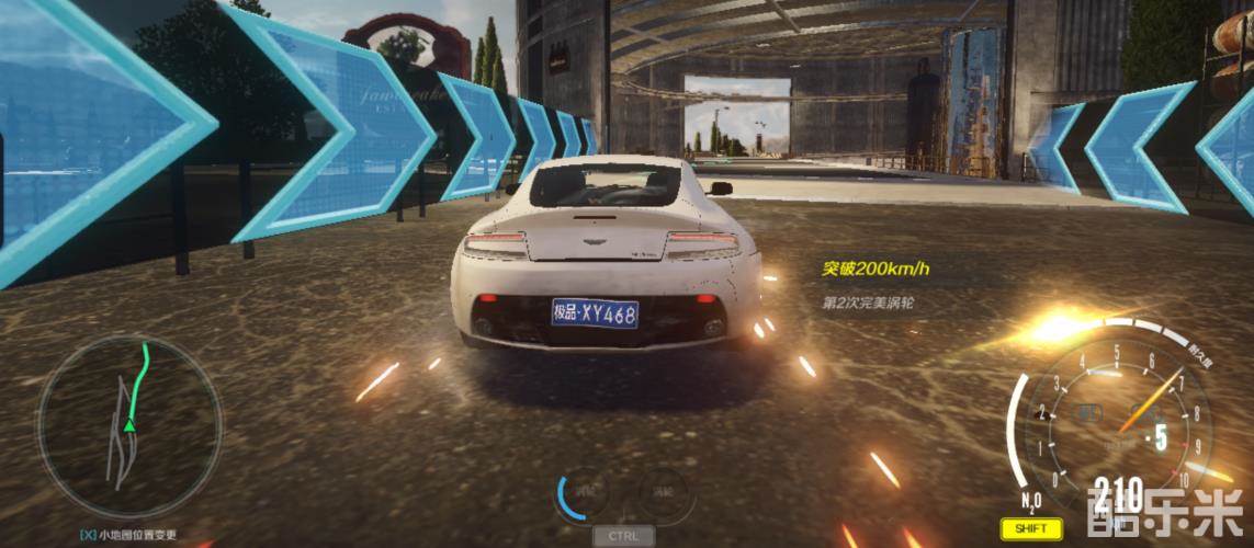 绿灯亮起,赛车犹如离弦的箭一般冲了出去,完美氮气释放过后,可以手刹漂移微微过弯。这时候,注意看路上的绿色箭头导航和前方的蓝色箭头,务必驶入靠左的小路,右边禁止通行。