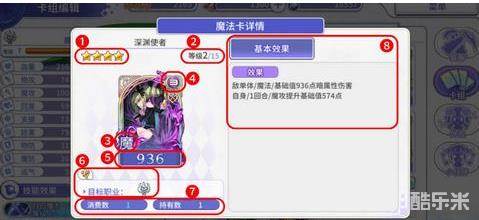 8. 基本效果:卡牌所拥有的基础效果。等级提高,魔法效果值随之提高,有的卡牌需要达到一定的等级后才会赋予新的效果。