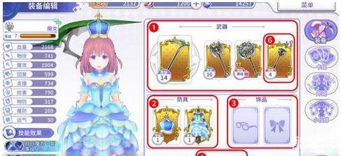 1. 武器 在初始时只开放1个槽位,角色阶位到达4后解锁剩下3个槽位,共4个槽位,影响物攻、魔攻、回复、支援、妨害五种属性。武器可通过扭蛋和主线任务获得。