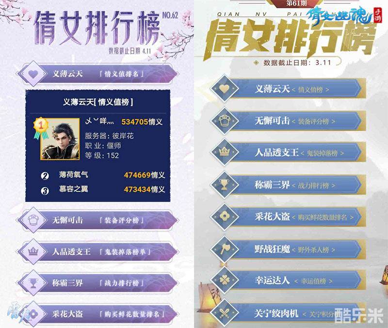 在本期膜拜榜中,来自【彼岸花】服务器的玩家【乄丷咩灬】以534705点情义独占义薄云天榜首;来自【雪中情】的玩家【莫离づ涟漪】则以217件鬼装掉落成为本期人品透支王;而幸运值榜首则由来自【巴山夜雨】的【小小究】以654幸运占据。其他更多精彩排行,尽在本期膜拜榜!
