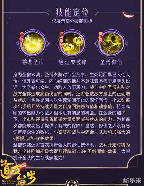 圣僧玄奘拥有“慈悲圣法”、“涅槃彼岸”、“圣僧御仙”三大强力技能。在对敌方全体造成高额伤害的同时,还能驱散敌方身上的正面增益状态。每次出手后都将回复自身大量怒气值。进可高额攻击,退可持久续航,真是居家旅行必备神仙呢!