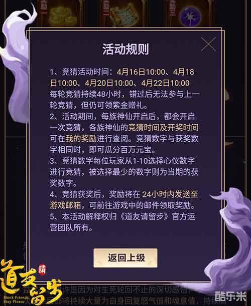 随着第一位佛族紫金神仙“圣僧玄奘”的曝光,佛族神仙竞猜活动也正式开启。每位玩家可以选择1-10中任意数字进行竞猜,竞猜人数最少的数字将成为当期获奖数字。猜中该数字的玩家将共同瓜分1000000元宝。活动详情也可以前往官网专题页https://act.jzyx.com/dy/newpg进行查看哟!