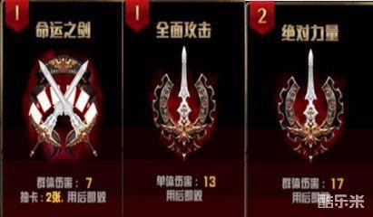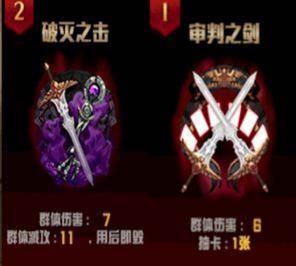 这5张牌也是很强力的存在,命运之剑和审判之剑的抽卡机制保证了优质的手牌;全面攻击的伤害爆炸,可惜只是单体伤害;绝对力量是一张强无敌的单卡,但在配合加攻卡上没有1费群伤好用,但仍然是一张很强的牌;破灭之击是一张攻守兼备的牌,使用之后怪物基本无法对我们造成伤害,唯一的缺点的就是费用过高,没有背叛之怒好用。
