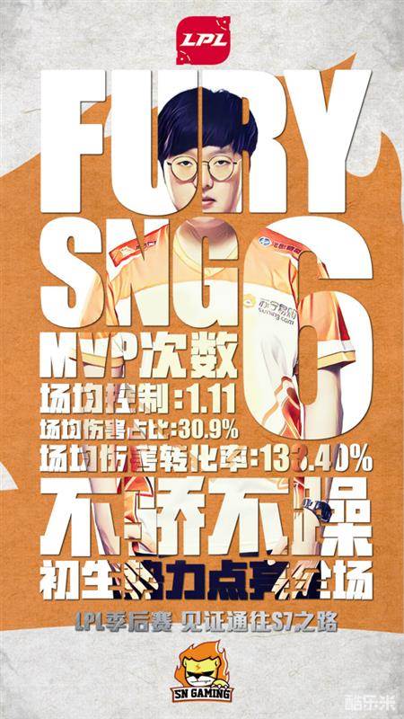 身为升班马,SNG期待能够在季后赛掀起一股黑马逆袭的风暴。毋庸置疑,队内ADC选手Fury将是他们在季后赛争夺中扬名立万的稳定carry点——常规赛阶段SNG一共赢下了18局对抗,其中三分之一的MVP都是由Fury夺得。此外,场均30.9%的伤害占比与1.11的场均控制都证明了他在赛场上的稳定性。