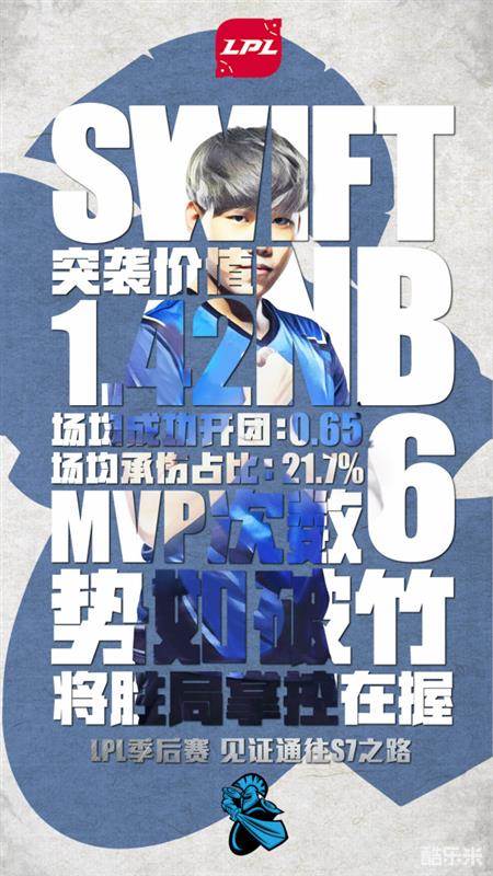 在获得良好发育的情况下,Rookie往往以超强的个人实力扭转乾坤,带领队伍在中后期团战中一步步取得胜势。常规赛阶段,Rookie8次夺得MVP,场均20分钟压刀数达到16.15,参团率也超过七成。毫无疑问,作为队内绝对核心,Rookie将是IG征战季后赛的王牌角色。