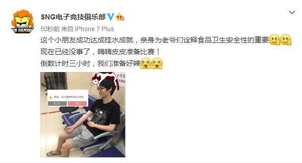 今天下午两点,IG与SNG的季后赛首轮角逐就要展开,上午SNG官博却发出了他们的辅助选手Yoon在医院打吊针的照片——