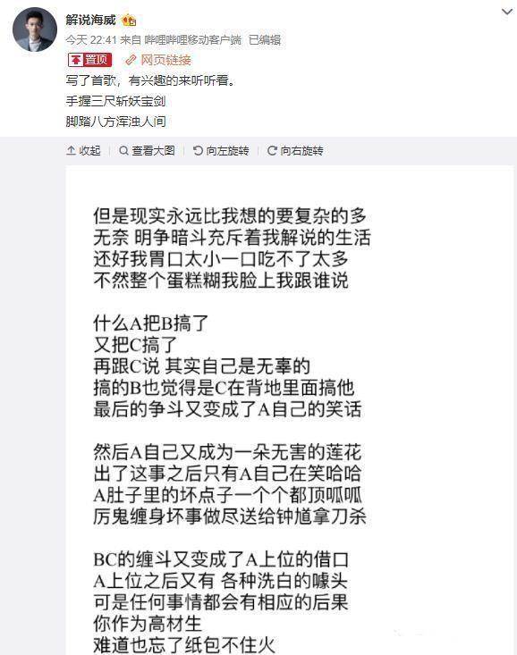 事情是这样的,晚上快11点的时候,解说海威在微博上分享了一首自己写的歌,并且在微博上PO出了歌词,其中部分歌词明确表示了解说生活明争暗斗,非常复杂,有人故意搞其他解说,之后又装作白莲花,利用别人上位之后,各种洗白炒噱头,但是你作为高材生,别忘了纸包不住火。