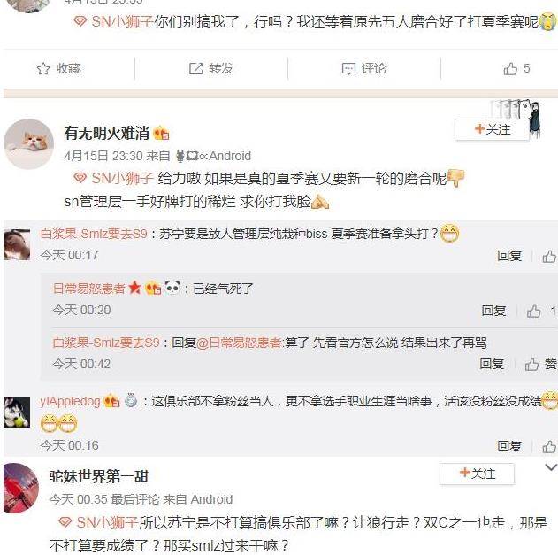 不过SN战队的粉丝就气炸了,他们一开始相信着SN银河战舰要起飞,后来SN战队跌入深渊,粉丝也认为队伍只是磨合得不够好,夏季赛要卷土重来,有争夺冠军的实力。结果现在王思聪告诉他们,SN银河战舰即将解体,作为队伍基石的狼行则突然跑去了RNG战队,这让SN粉丝怎么能接受得了呢?SN粉丝大骂俱乐部:“夏季赛拿头打,不把粉丝当人,还买SMLZ干什么!”